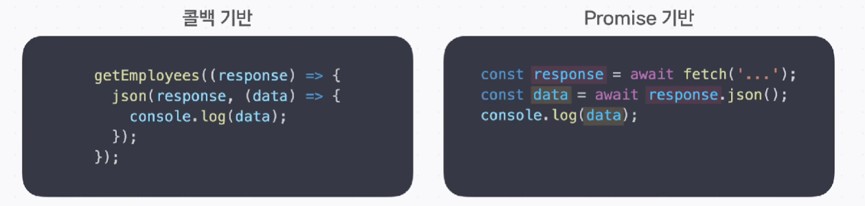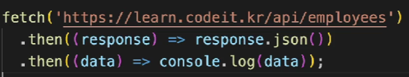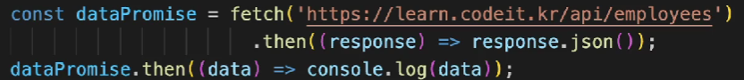 - 실행 순서 (앞선 비동기 작업이 완료되면 등록된 콜백을 실행) : fetch()에 대한 리스폰스가 돌아오면 .then()을 실행 → response.json이 실행되면 dataPromise.then()이 실행