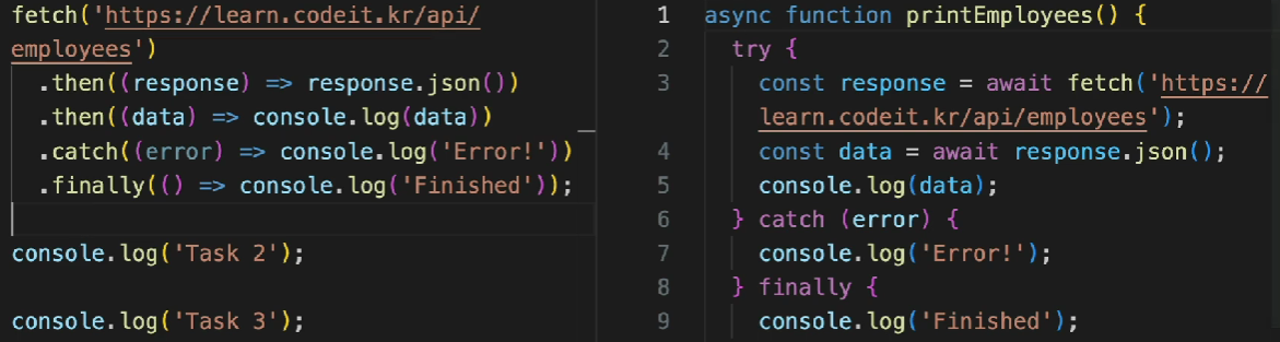 - fetch() 앞에 await : 프로미스가 Fulfilled 또는 Rejected가 될때까지 기다림
