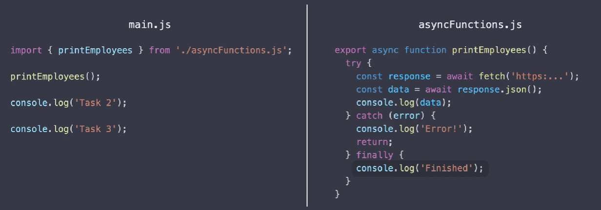 아래 두 코드가 있을 때 main.js를 실행하다가 asyncFunctions.js를 실행하고 여기에서 async 함수 안의 await을 만나면 fetch()의 프로미스가 fulfilled가 될 때까지 다시 main.js로 나가 이후 실행문을 실행함